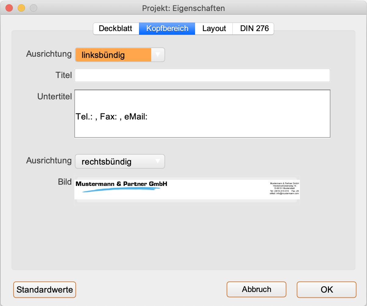 Jedes Projekt kann individuell gestaltet und gegebenfalls für den Bauherrn angepasst werden. Wählen Sie den Reiter Kopfbereich, um den Kopfbereich des Projekts individuell festzulegen.