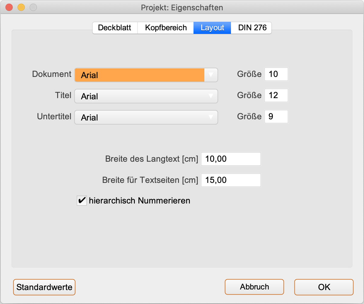 Wählen Sie den Reiter Layout, um das Layout der Projektdokumente zu bearbeiten.
